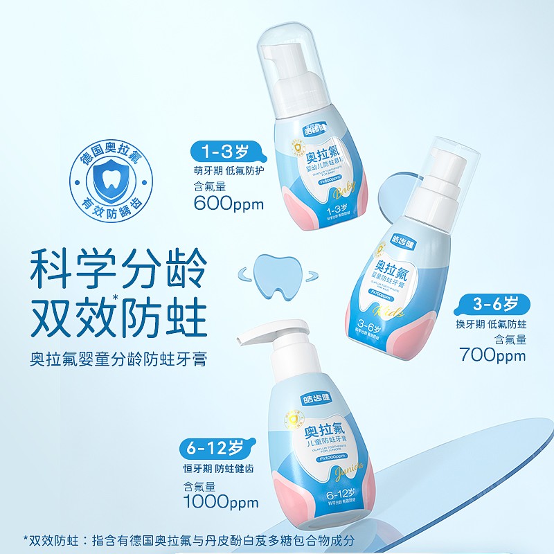 - 6-12歲:0.1%德國高純奧拉氟+氟化鈉雙防蛀,抗糖酸護恒牙,高延展防蛀精華適配正畸需求。